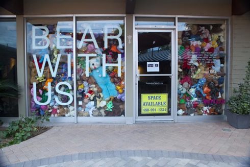 Phoenix artist Tara Logsdon’s EKLbearmy is a rescue and rehab mission for wayward teddy bears. In BEAR WITH US, 50 rehabbed bears joined 100s of other bears to share a message about coming together during trying times with the viewer. The bears filled the storefront windows floor to ceiling, resulting in an eye-popping demonstration of individuals creating a powerful whole.