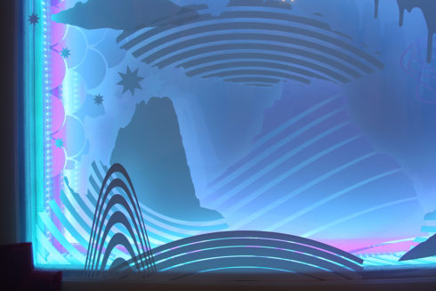 Hey, I Made This For You is an immersive lighting installation transforming an entire room within Practical Art. Daniel Funkhouserdesigned the space to continue its use for classes and workshops. Striped walls and colorful larger than life frames surround light boxes made of multiple layers of cut vinyl, transparent acrylic, and LEDs. As the lights change, the vinyl surfaces and surrounding walls create a surprisingly soothing experience for the viewer. Imagery and details reference handmade goods found at Practical Art combined with patterns and space scenes thatFunkhouser is known for.