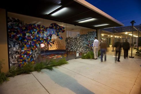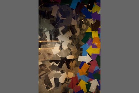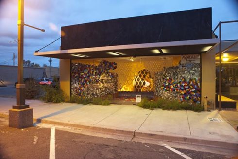Ryan Peter Miller from Tempe depicted the story of paint through a visual evolution of representative techniques—flat illustrations progressed through drips, splatters, and pools of paint to dimensional sculptural forms. All elements were applied to fabricated panels placed within the space to create a layered composition, drawing the viewer through this visual evolution. This dynamic installation addressed the continued adaptive ability of paint within a burgeoning visual culture, drawing a direct parallel to the accompanying economic shift.