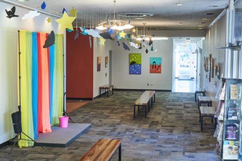 The playful colors, whimsical silhouettes, and mirrors of the wall pieces allow viewers to be a part of the artwork. If they take a look in the mirror they might find themselves “wearing” sunglasses, a snorkel, or suddenly having a new hairstyle. The immersive environment allows visitors to imagine themselves as their own art piece and invites them to step up onto the photo booth stage and snap a photo using one of the many colorful and fun props.