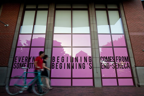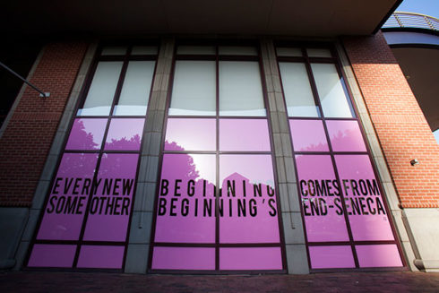 The central component of New Beginningsis a quotation from 1st Century playwright Seneca the younger, “Every new beginning comes from some other beginning’s end.” These words are particularly resonant at this time and location for many reasons. Most immediately, the words recognize the closing of the Borders bookstore chain, and the other vacant storefronts on Mill Avenue, while they simultaneously encourage passersby to think of what could be in the vacated storefronts in the near future.