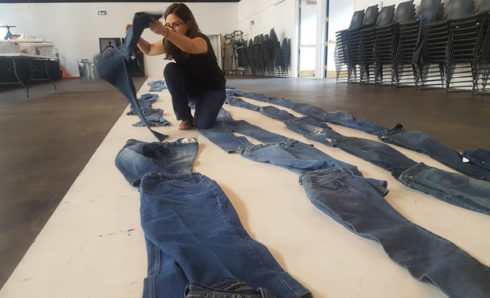 This installation metaphorically speaks to the new life of the F.A.B.R.I.C. building: once a performing arts center, now transformed into a resource and laboratory for fashion innovation. As this building gathers and serves a community of creative individuals, “Stitch” collects the jeans of many people. Jordá joins the jeans in unexpected ways by stiching them throughout the building’s brick wall. This serves as a visual expression of the space it occupies and can investigate how we think about the role that fashion may play in our lives.