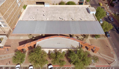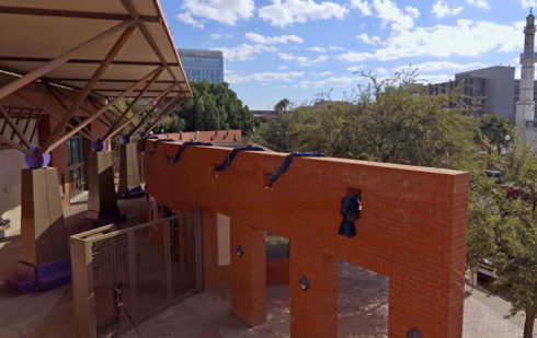 Through a site-responsive installation “Stitch” , Saskia Jordá plays with the idea of hand stitching directly on the building, taking advantage of the serendipitous presence of the holes in the curved wall of the courtyard space at F.A.B.R.I.C. – Arizona’s Fashion Headquarters. This installation takes one of the elemental characteristics of garment-making and magnifies it for the public to see.