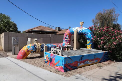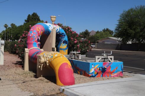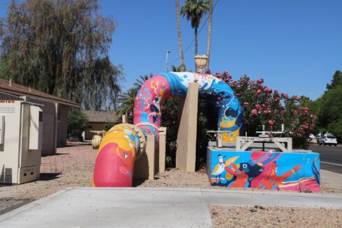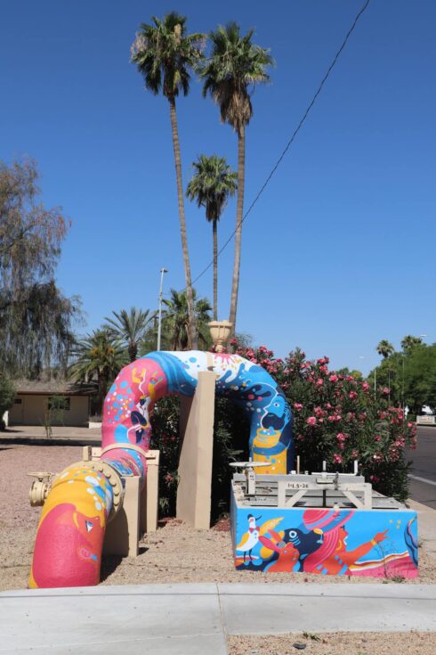 This is a mural to light up our mundane life and appreciate water resources. The shape of the pipe and well as the combination is not block-shaped like the house in the neighborhood. To take advantage of the site and shape, I had this idea of The Magic of Water. The mural resonates with the dynamic and gentle character of water and the shape of the pipe. The main colors are blue, azure, orange, and pink. It represents water and desert, cool and hot. Since it is a street installation, no light color was used.
