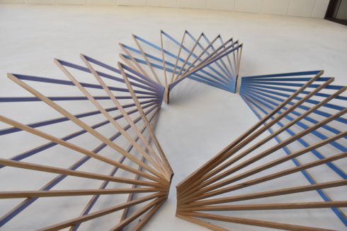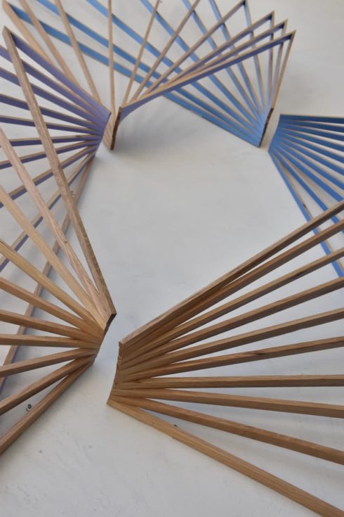 This piece consists of three separate units made from oak. All of the units are based on the same repeating two-point system, with dimensional variations. The colors that appear on the inner aspects of each unit change slightly as they are viewed from different positions.