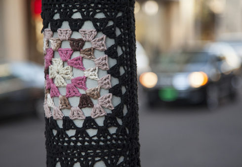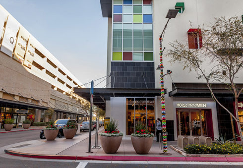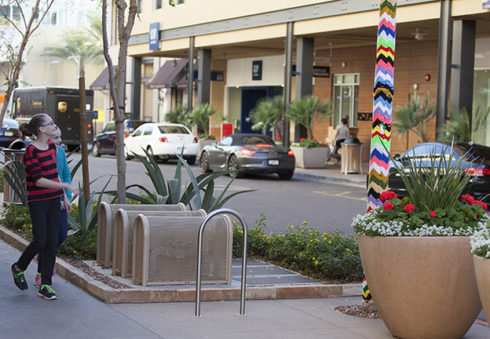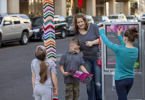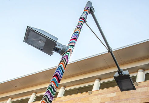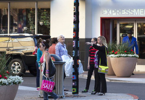 Arizona’s “Textile Tagger” Kristin Wolfe from Scottsdale brings her passion for yarn-storming to six 18-foot high light poles along 72nd Place at Scottsdale Quarter. The poles have been temporarily transformed from ordinary objects into works of art—completely covered in bright, patterned knit and crochet all hand-stitched by Wolfe.