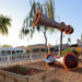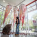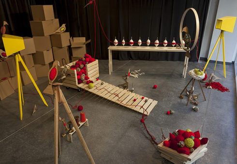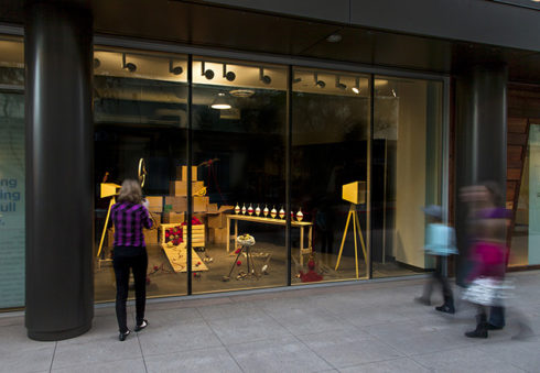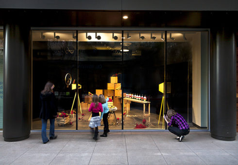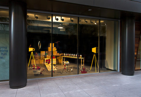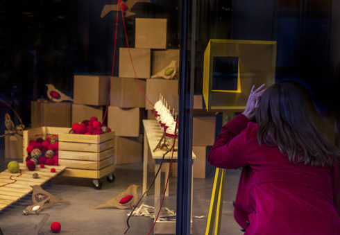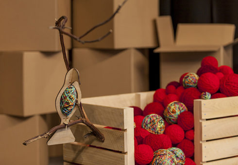 Inspired by harvest time, factory assembly lines, yarn balls, vintage toys, birds, tools, and the secret compartment in the wooden desk made by her grandfather during her childhood, Phoenix artist Saskia Jorda created a storefront installation at Scottsdale Quarter resembling a playful workshop setting inhabited by wooden birds. The space appears as if it was left in the process of assembly or in the joyful disarray of play—presenting a whimsical and fictional space amidst a carefully composed chaos. The viewer is invited to invent a possible story for the scene, drawing their own lines between work and play.